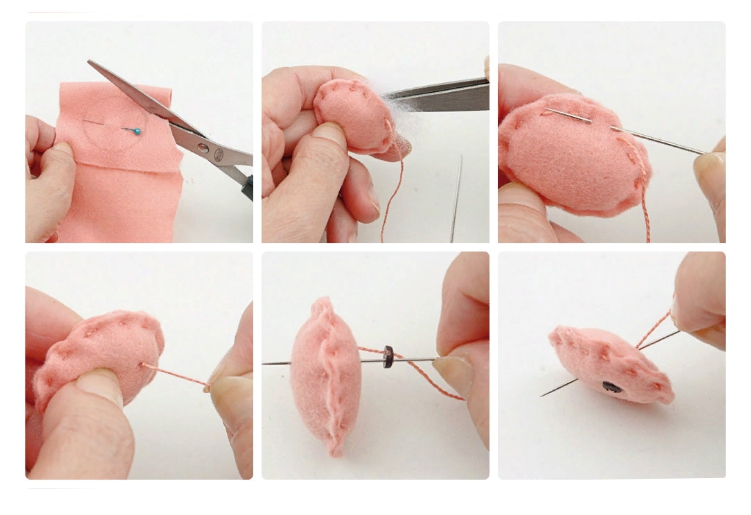 Проделайте те же действия с пяточком свинки. Прошейте его и заполните синтепоном. Поверх носа пришейте пару стразин или черных бусин, чтобы сделать мордочку более правдоподобной.