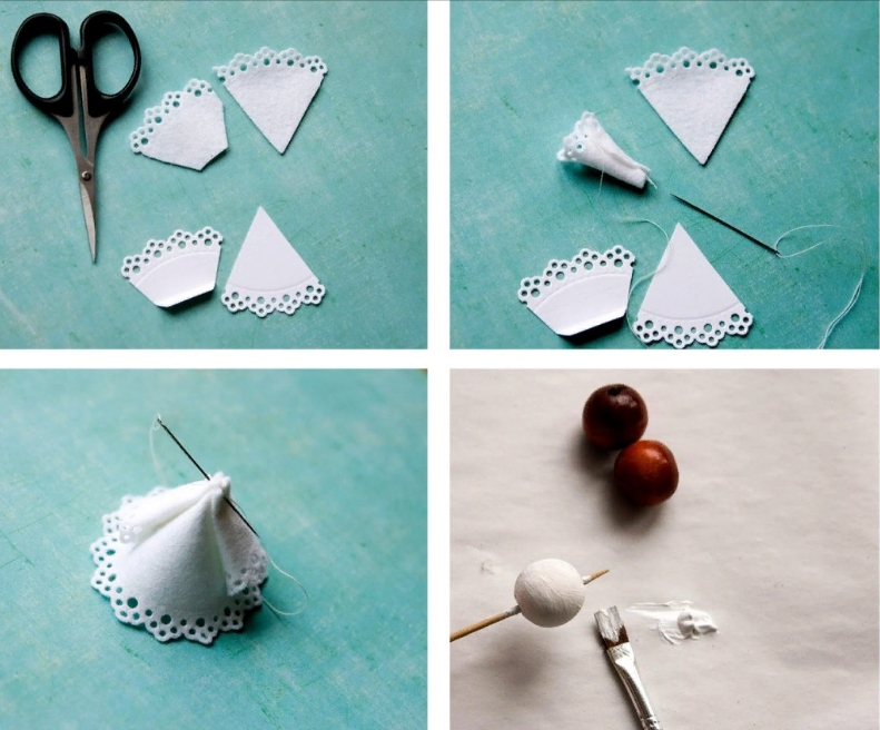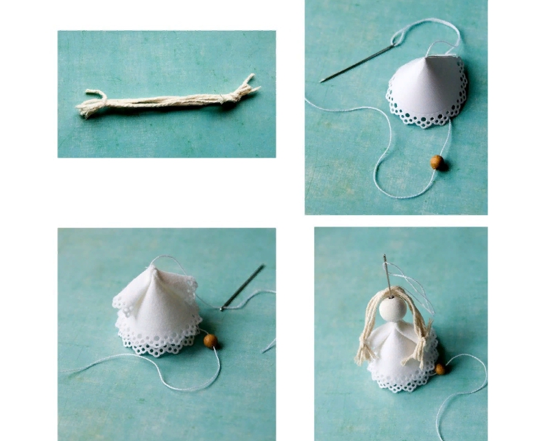 Подготавливаем веревку, на которую будем подвешивать ангела. Пока у нас нет головы фигуры, продеваем через фиксирующий шарик нить, теперь берем картонное основание, сверху одеваем на него основание из фетра, под низ вставляем шарик-фиксатор, продеваем через него нить. Нанизываем иглу на юбочки, затем продеваем нить в голову. Из шерстяных нитей делаем «волосы». Фиксируем все нитью.