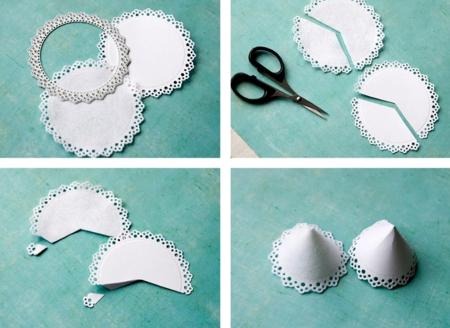 Нарисуйте на листе картона круг, с его помощью мы будем рисовать заготовку. А также использовать бумагу в качестве подклада. Обведите на фетре контур по краям шаблона. Вырежьте его ножницами, затем на круге из фетра отрежьте третью часть. На картоне тоже. Отложите малые части в сторону, они нам пригодятся позже. А пока срежьте край на части у фигуры 2/3, как показано на рисунке. Проделайте это с фетром и бумагой. Загните в месте среза белую ткань в обратную сторону, так, мы получим место для склеивания ровного конуса, на картоне тоже делаем загиб.