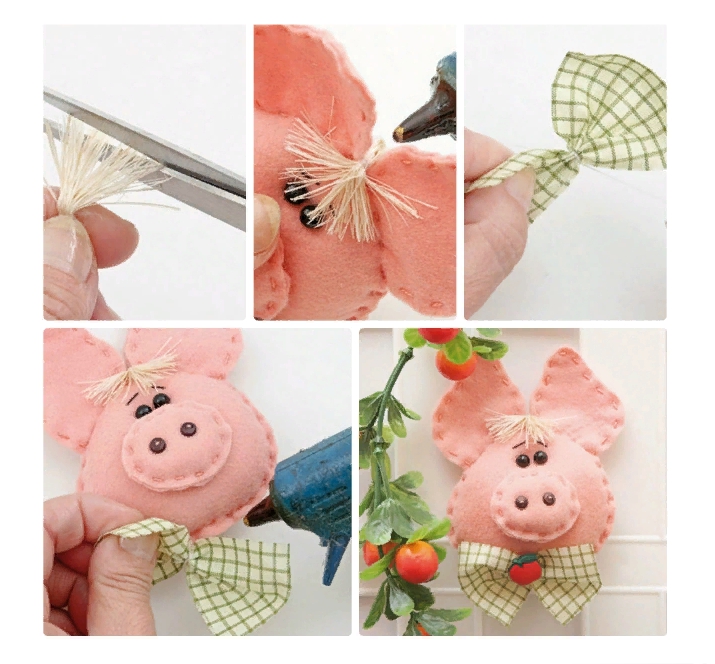 На завершающем этапе подготавливаем чуб хрюшки и украшение в виде банта. Теперь наш поросенок готов и может отправляться на елку!