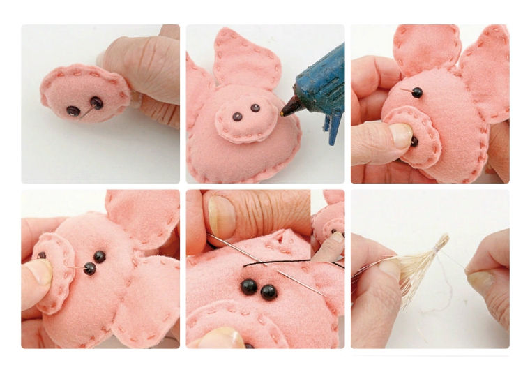 Теперь займитесь глазами. Пришейте их к голове будущего поросенка. В качестве заготовки можно использовать те же бусины, что вы пришили для носа. Рисованные глазницы или уже готовая фурнитура, тоже сгодятся.