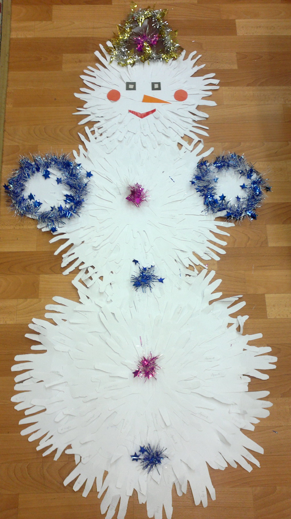 • Снеговик из детских ладошек. Несложное задание, которое под силу выполнить каждому ребенку. С таким заданием малыши получат еще и массу удовольствий. В игровой форме воспитатель собирает обрисованные детками ладошки, вырезает их и крепит к общему снеговику. Такую фигуру можно поставить на вход раздевалки или в актовый зал, где проводятся утренники.