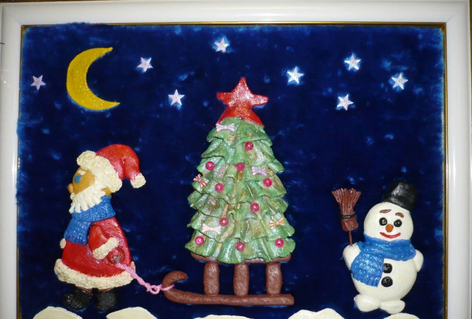Картину можно не только нарисовать, но и дополнить элементами из ткани, соленого теста или пластилина. Предлагаем воспользоваться идеей на фото ниже. На бархатном фоне прикреплены фигуры из соленого теста. Чтобы они лучше держались, предварительно смажем их клеем ПВА или суперклеем. Далее сформируем специальной лопаткой для работы с пластилином формы. Дадим тесту высохнуть, а затем раскрасим.