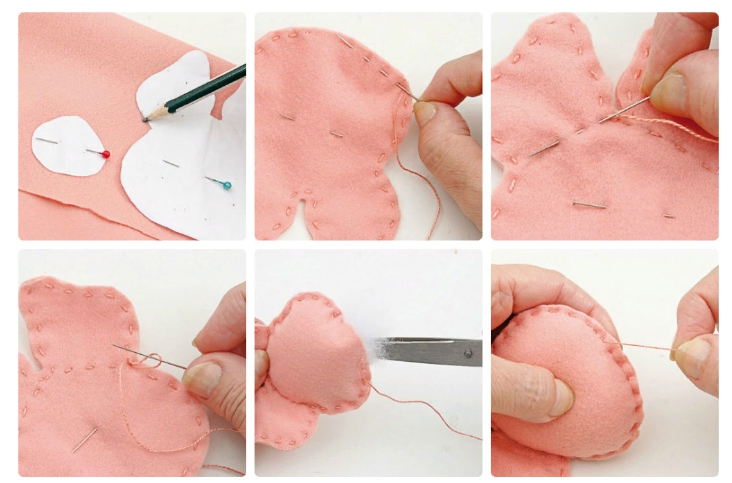Обведите детали на ткани и вырежьте их. Прошейте соединенные заготовки красивыми стежками и оставьте примерно 1 см не прошитого пространства. В эту дырочку просуньте синтепон или вату. Зашейте деталь.