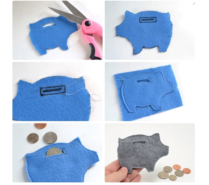 Вырезаем из плотной ткани две одинаковых детали. Одну без прорези для монет. Обшиваем денежное отверстие, чтобы зафиксировать тканевый ворс. Далее красивыми стежками обходим контур копилки, сшивая между собой 2 части поросенка. Копилка готова, пользуйтесь новогодним символом!