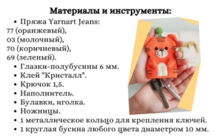 Актуальной игрушкой в виде доброго тигренка в комбинезоне станет вязаный брелок. Его величина 8 см.