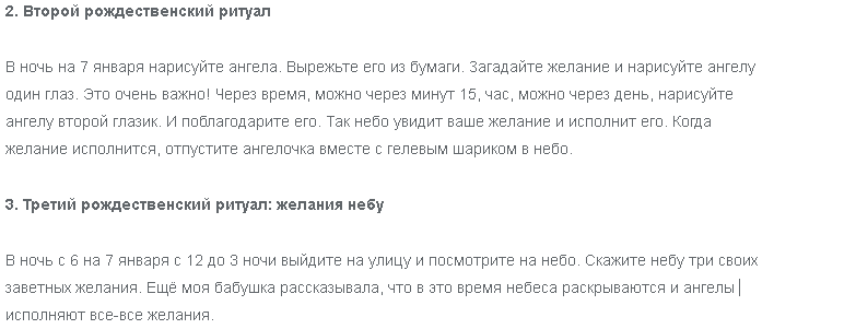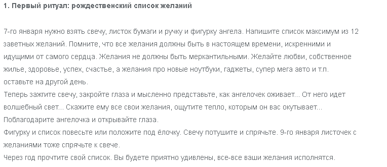 Все знают, что новогодняя ночь, волшебная. Загаданные желания именно в это время, под бой курантов, имеют все шансы сбыться. Содействуйте исполнению своей мечты заблаговременно, напишите их на бумаге. Если, вам не удалось по каким-то причинам, загадать желание в Новогоднюю ночь, не стоит расстраиваться, ведь существует еще Старый Новый год и Рождество. В рождественские праздники вы можете загадывать желания в течении праздника, соблюдая определенные ритуалы, но особенно сильна сама рождественская ночь.
