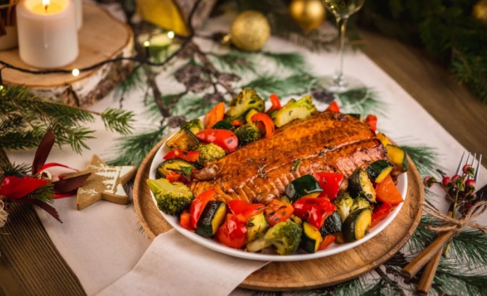 Главное правило — много овощей, фруктов. Из горячих блюд можно подать курицу, баранину, рыбу, морепродукты, а салаты обязательно украсить зеленью. Из десертов допустимы тортики, пирожные, печенья, конфеты, но только такие, в которых при приготовлении не используется желатин.