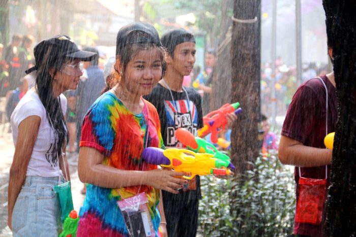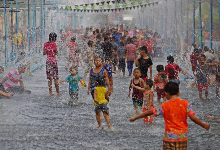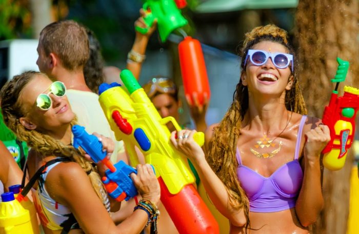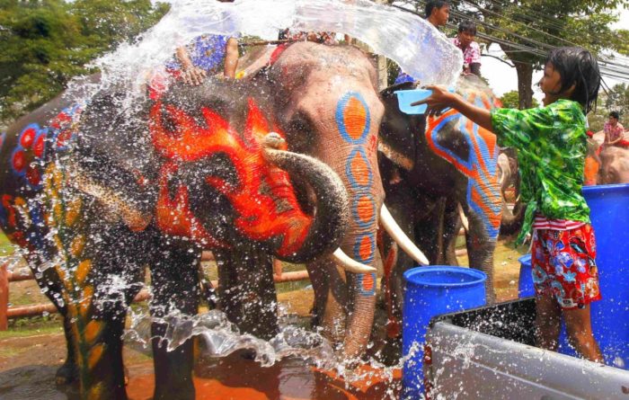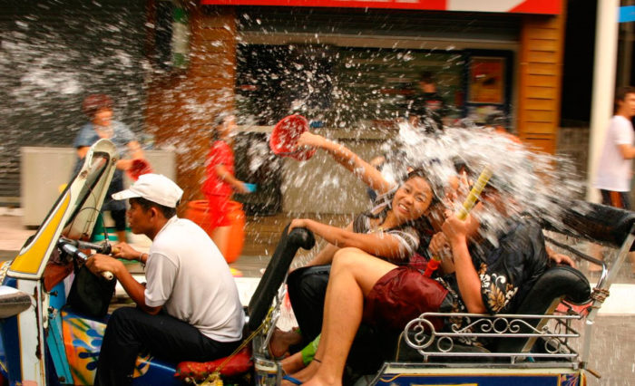 Фонтаны воды выльются на ваши головы из разных устройств, начиная от ведер, шлангов, водяных пистолетов, водометов и даже из хоботов разрисованных слонов. Считается, что вода смывает все плохие прошлогодние события.