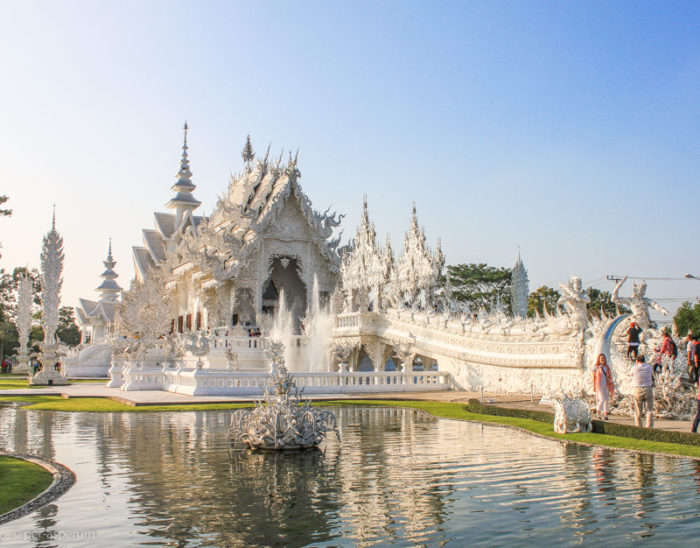 Белоснежный буддийский храм построен сравнительно недавно на личные средства тайского художника Чалермчая Коситпипата. Это уникальное произведение искусства словно соткано из белых накрахмаленных кружев. Белый цвет символизирует чистоту помыслов Будды. В стены храма вставлены небольшие кусочки зеркал, которые сверкают и переливаются на солнце — и это мудрость Будды.