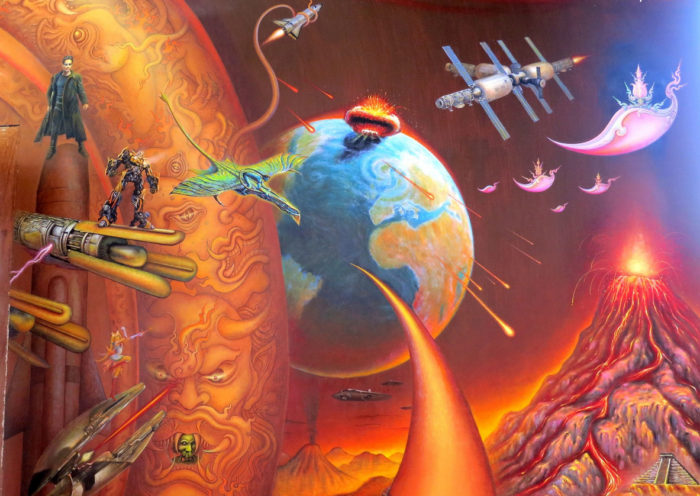 Внутренние росписи стен храма не традиционны. Здесь запечатлены современные персонажи, известные нам из фильмов «Аватар», «Человек-Паук», «Звездные войны». На стенах изображены даже горящие башни-близнецы. Так художник выражает борьбу Добра со Злом.
