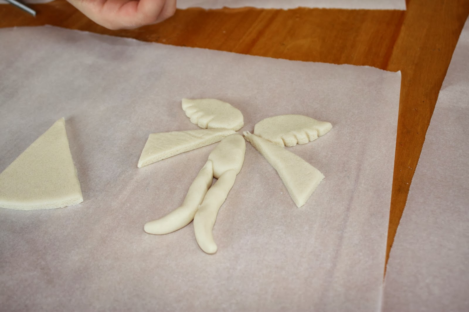 Уберем шар в холодильник, через час достанем и вылепим из него ангелов. Раскатаем отрезки теста, произвольно вырежем части и сформируем ангелов.