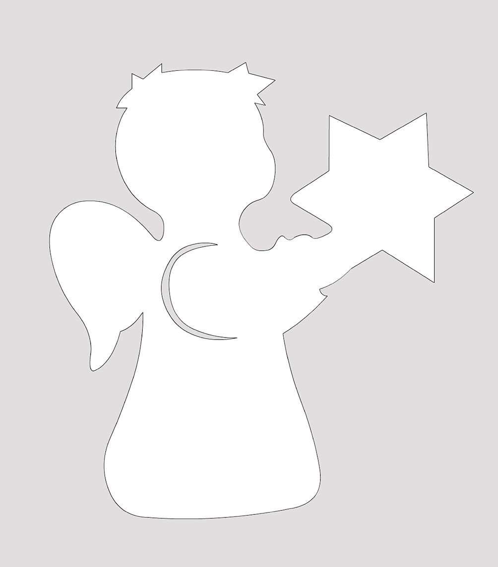 Также на бумаге допустимо нарисовать и вырезать небесного посланника. Но, чтобы ангел был объемным, его необходимо сделать из нескольких деталей, склеить их или закрепить в местах с резным креплением, как на фото ниже. По желанию трафареты можно сделать цветными.