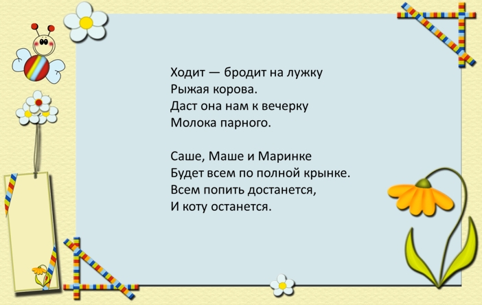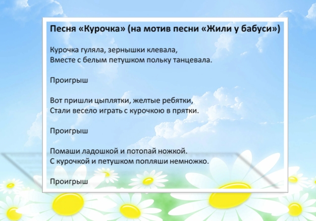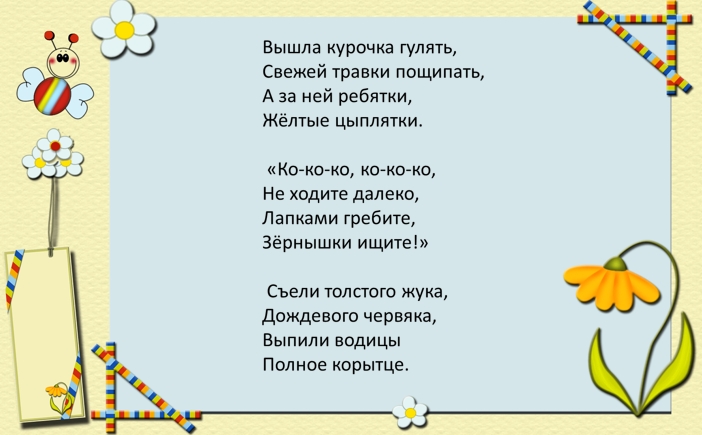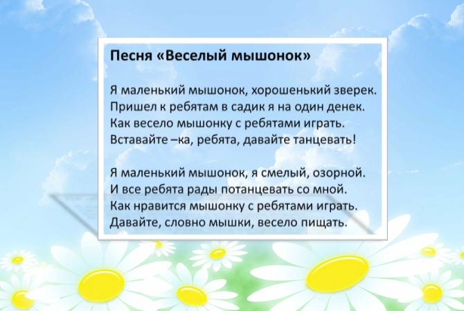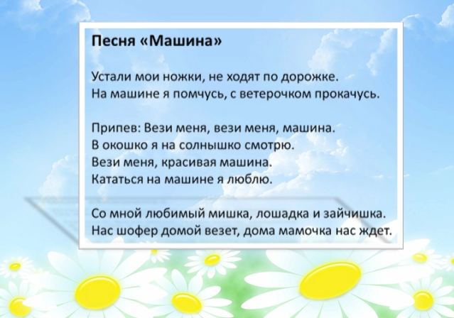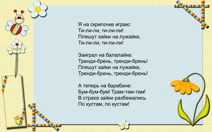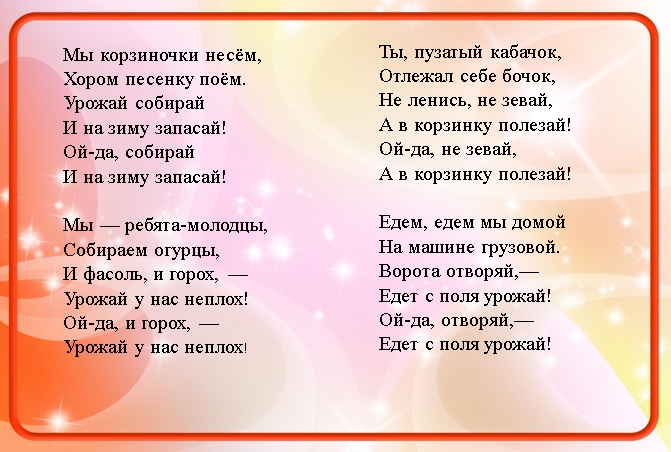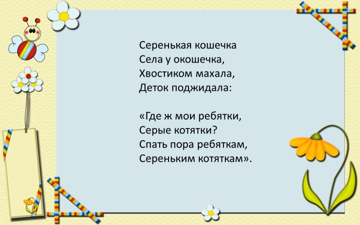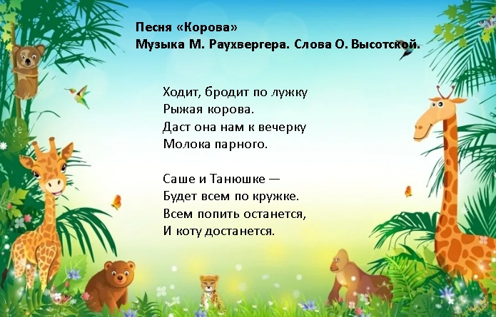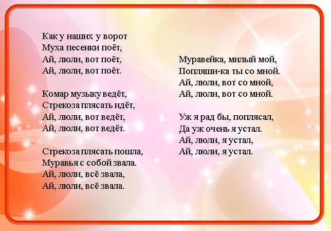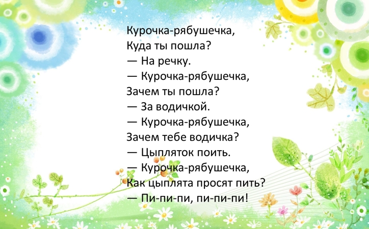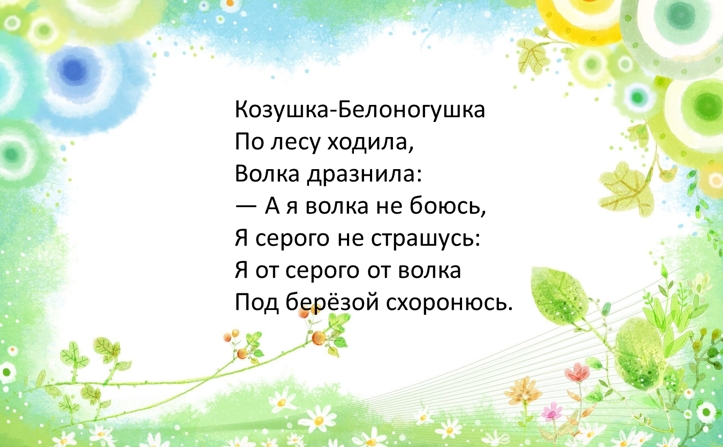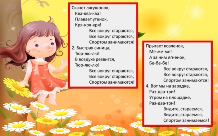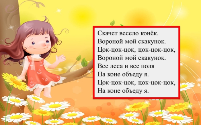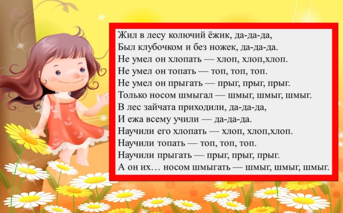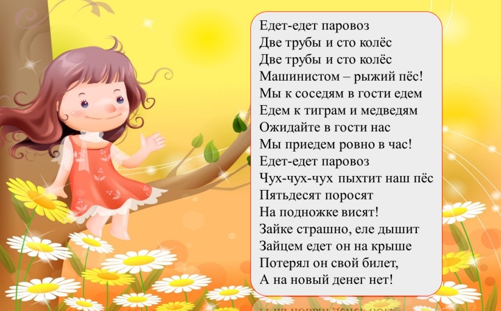 С двух лет детишки запоминают все, что слышат и повторяют вслух услышанное. Таким образом, у них развивается речь и мышление. В этом возрасте песенки должны быть мелодичными с более насыщенным сюжетом. Если вы не знаете мотива на приведенные ниже стихи можно подобрать свою мелодию, которая больше нравится.