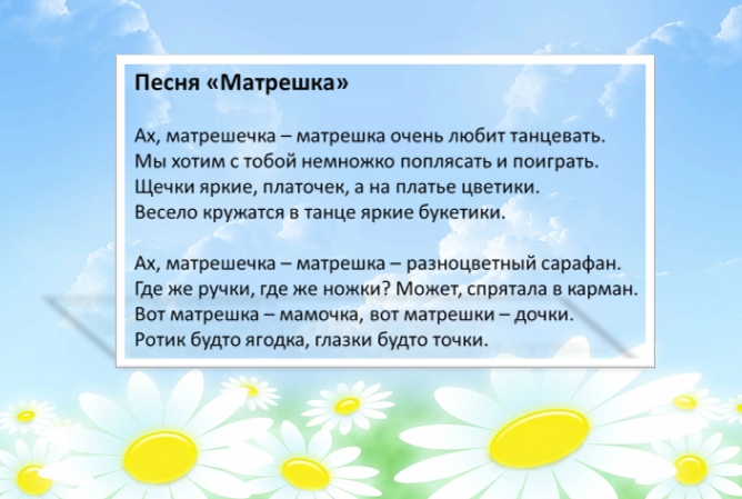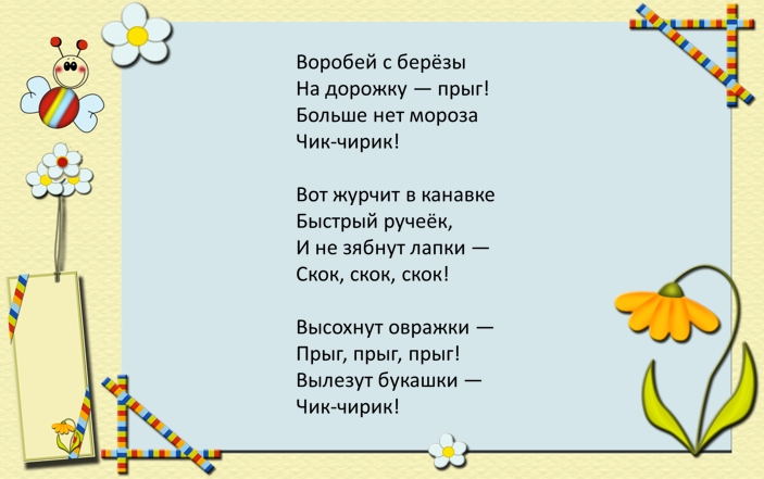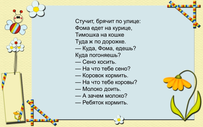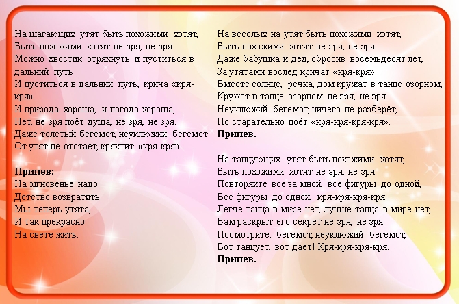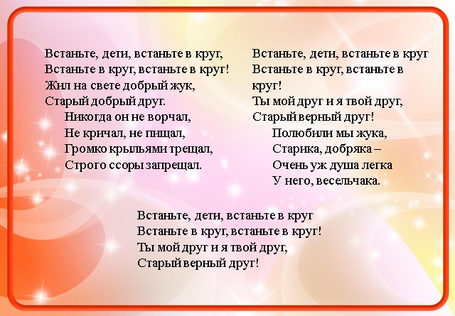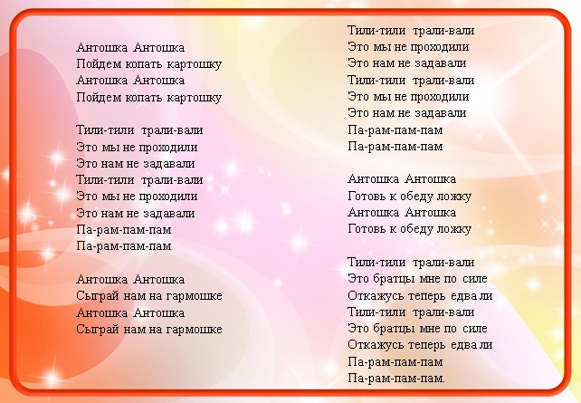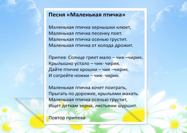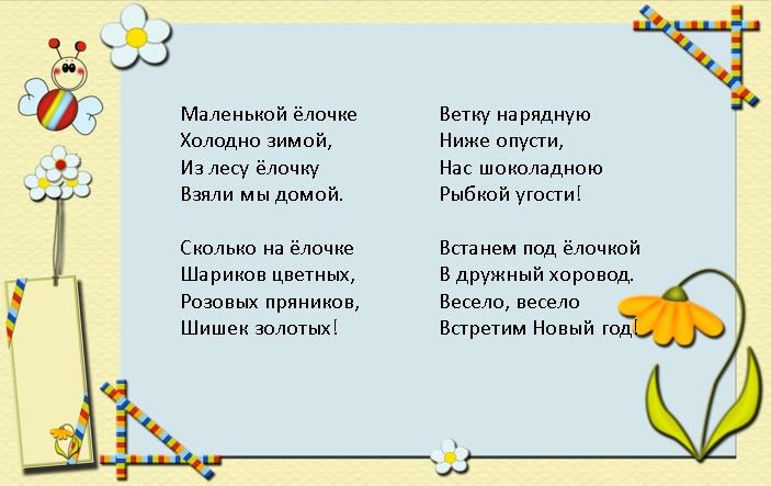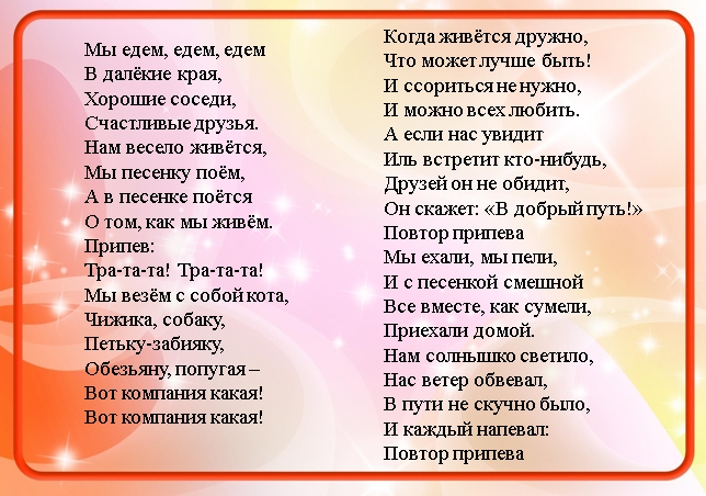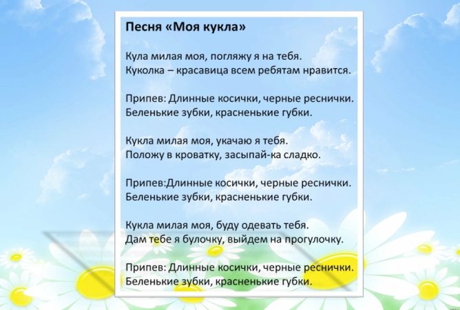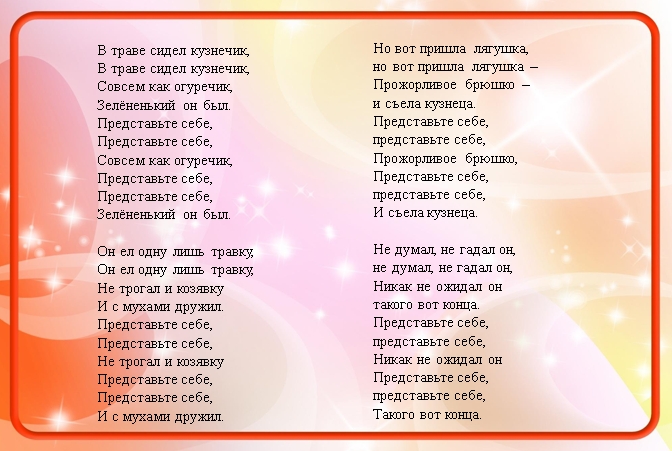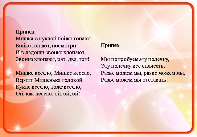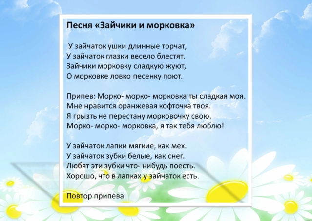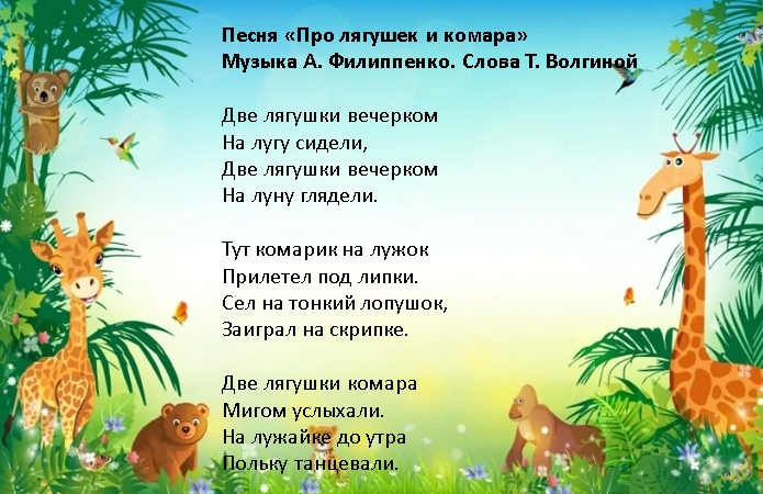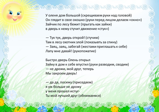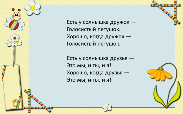 С двух лет детишки запоминают все, что слышат и повторяют вслух услышанное. Таким образом, у них развивается речь и мышление. В этом возрасте песенки должны быть мелодичными с более насыщенным сюжетом. Если вы не знаете мотива на приведенные ниже стихи можно подобрать свою мелодию, которая больше нравится.