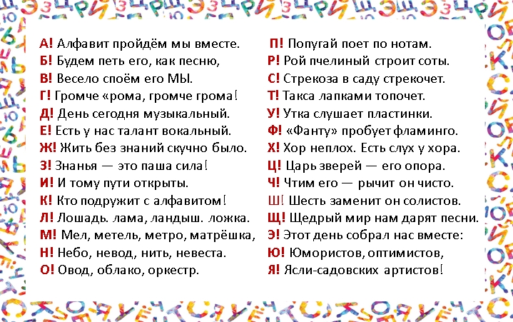 Чтобы помочь ребенку запомнить алфавит, предлагаем разучить с ним эту песенку на стихи Ильи Резника и музыку Раймонда Паулса.