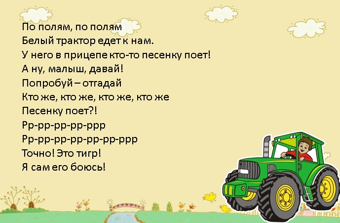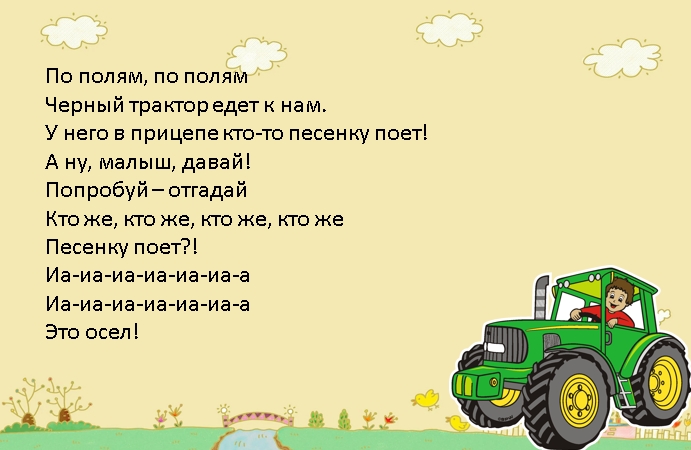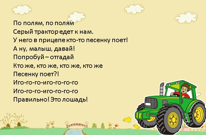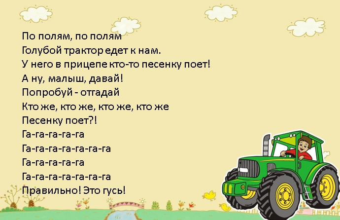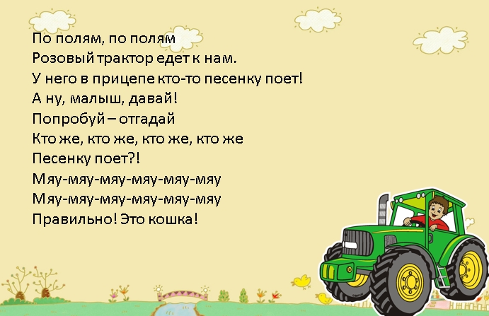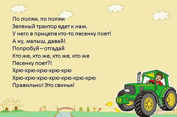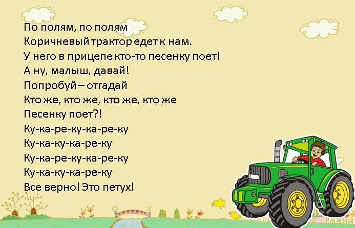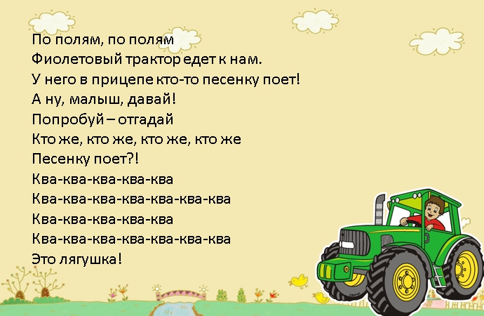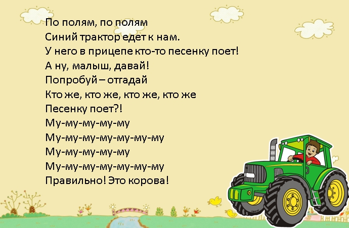 Песенка про трактор, так же из «Кукутиков». В интересной и веселой форме в ней поется не только о едущем тракторе, но и о животных, которые встречаются ему на пути. Важно, чтобы ребенок по звукам, которые издает животное, знал, как оно называется.