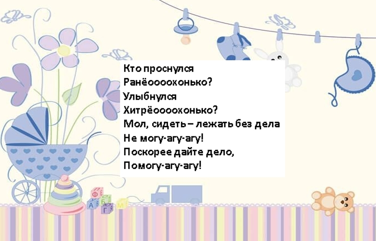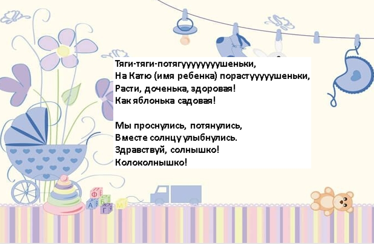 Во время потягивания младенцу тоже поют песенку или проговаривают стишок, растягивая звуки. Малыш будет выделять гласные в маминой голосе.