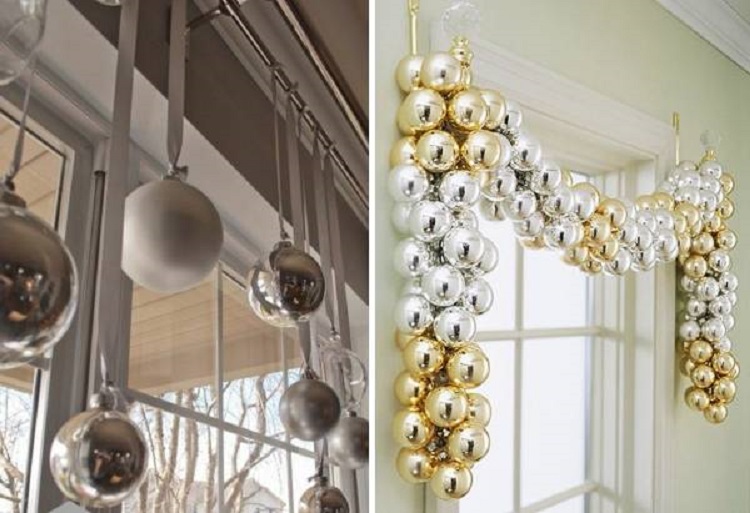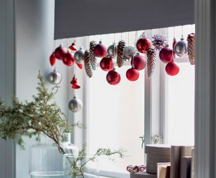 Каждый год мы стараемся приобретать что-то новенькое, шары, банты. Прошлогодние игрушки довольно часто приходят в непригодность. Все, что остается после оформления ели: шары, ленты, еловые шишки, гирлянды, банты можно использовать на декор окна.