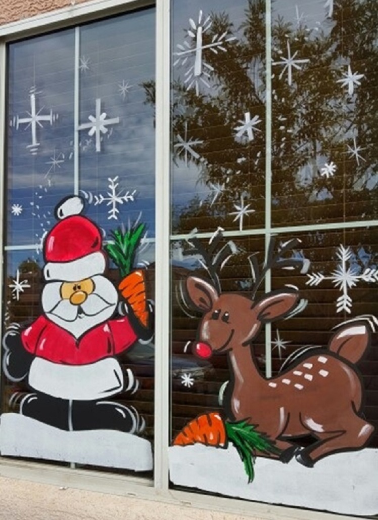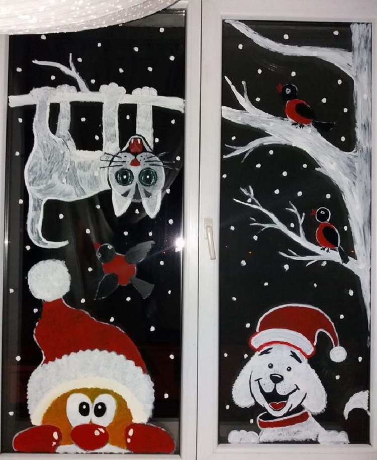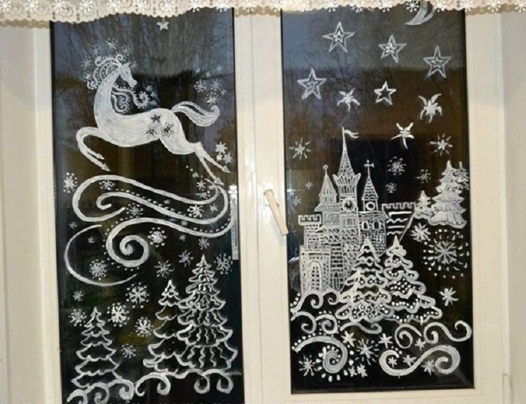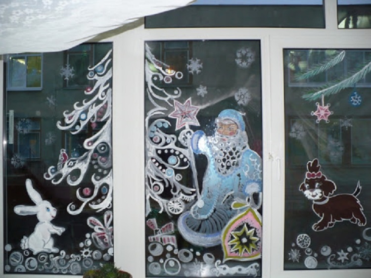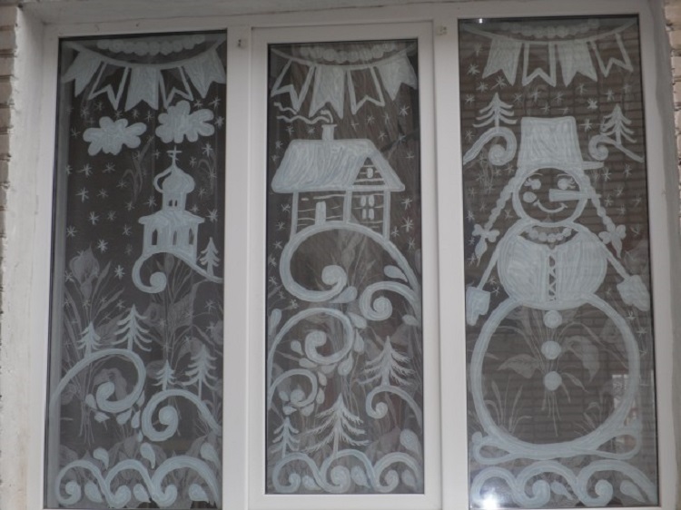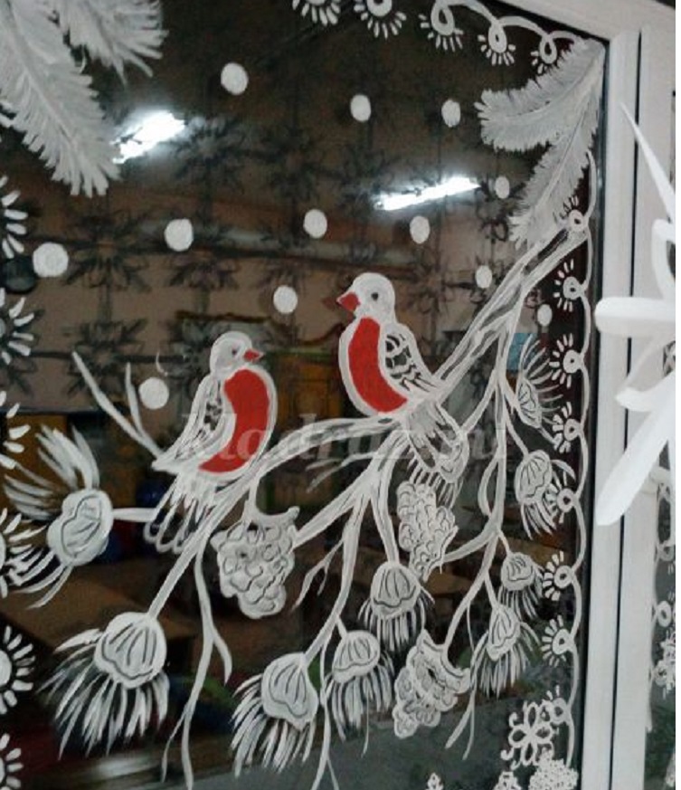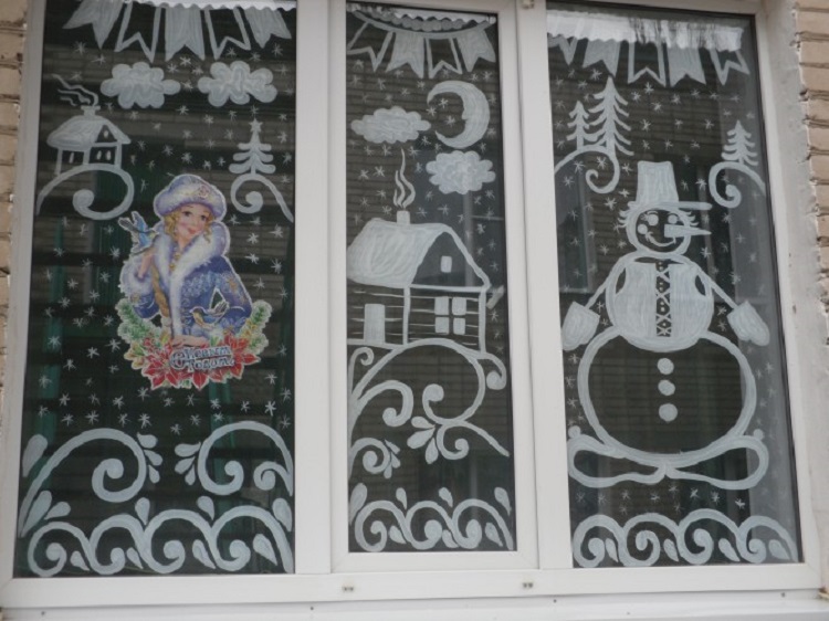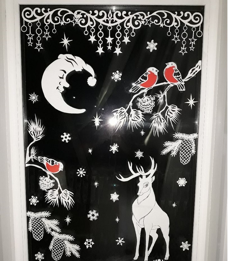 Более качественной выглядит работа с использованием меловой краски, гуаши, зубной пасты. Такие рисунки словно оживают на окне. Чтобы нарисовать рисунок, не обязательно нужно быть художником! Сначала на бумаге рисуем рисунок, после вырезаем трафарет. Следующий этап обработка трафарета краской или зубной пастой уже по стеклу.