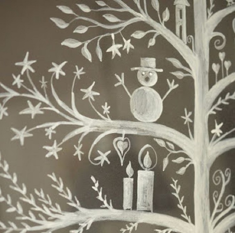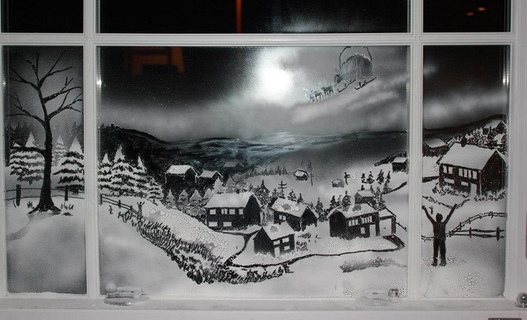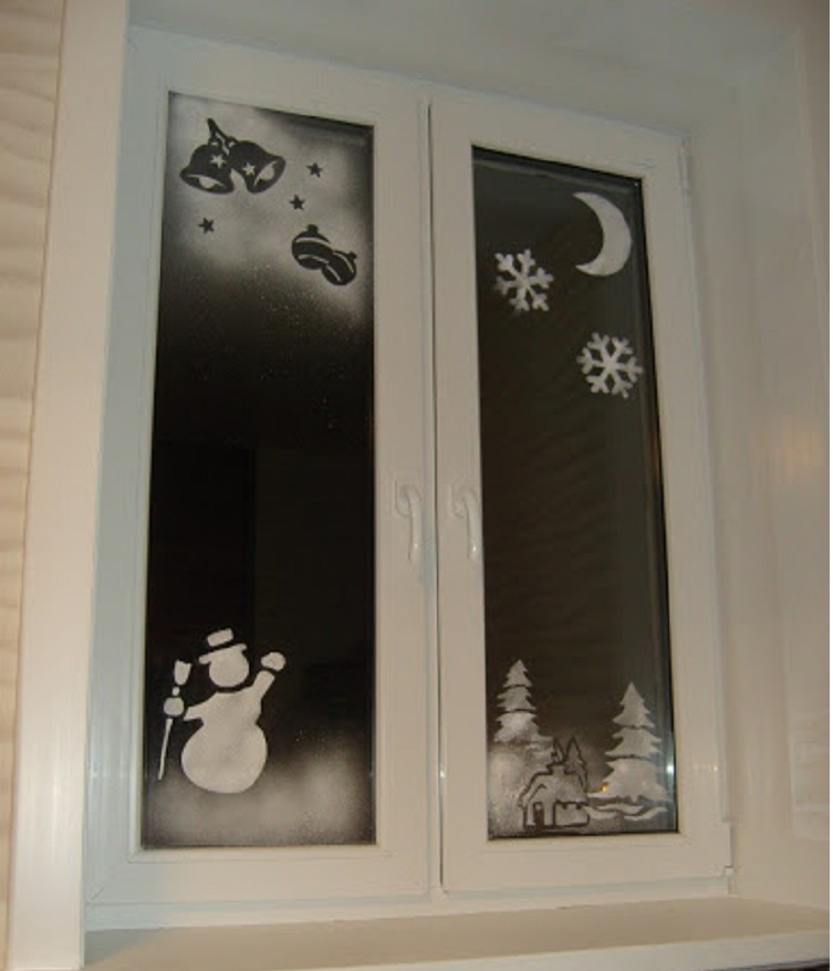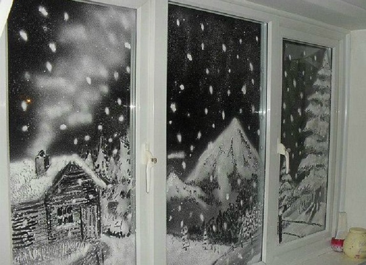 Такие картины могут быть отдельной композицией или дополняться рисованием. Главное тут соблюсти баланс, чтобы не перегрузить окно. Нарисованные детали должны составлять не более трети основного рисунка.