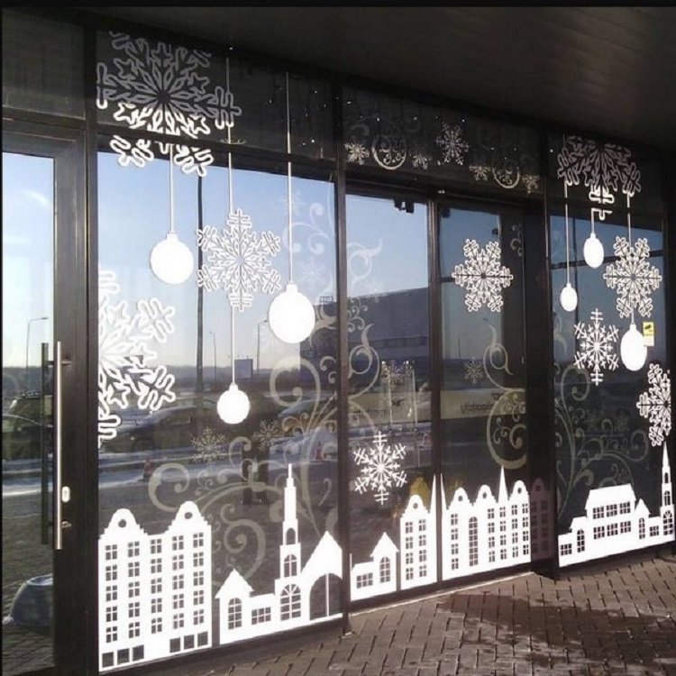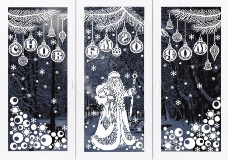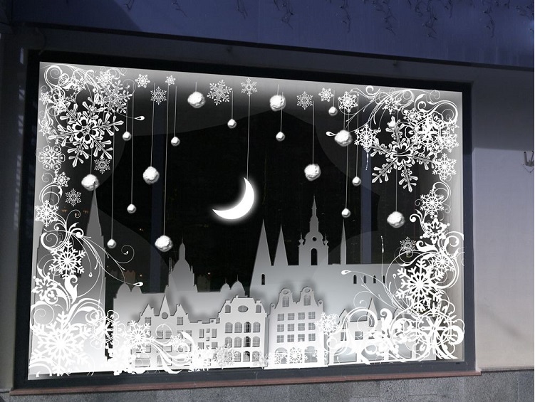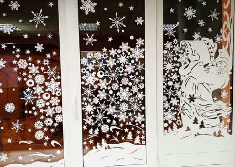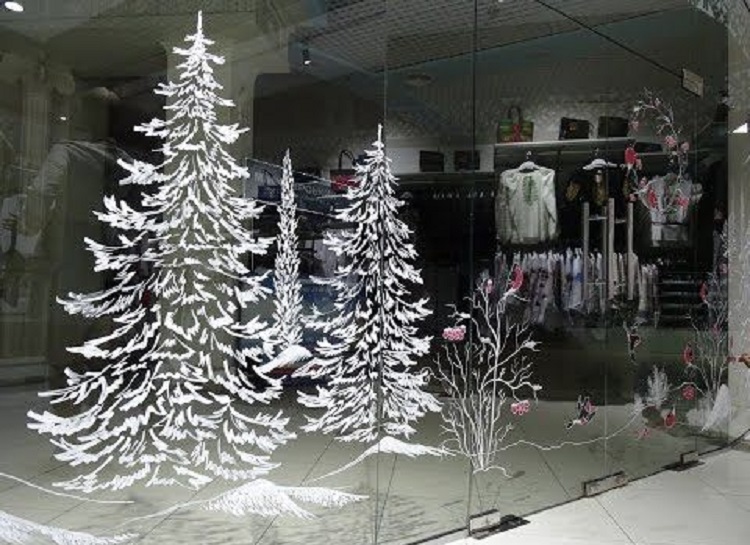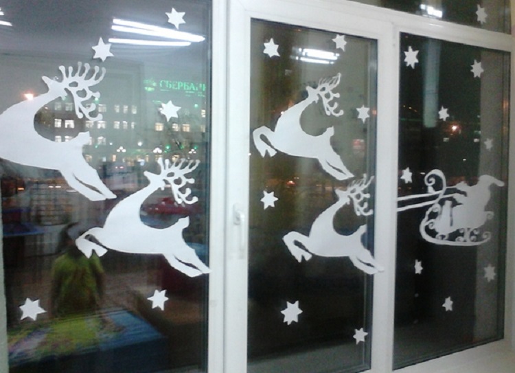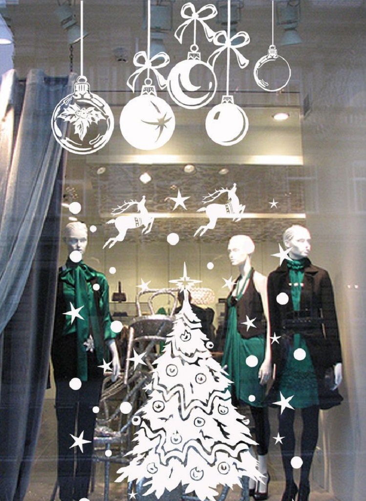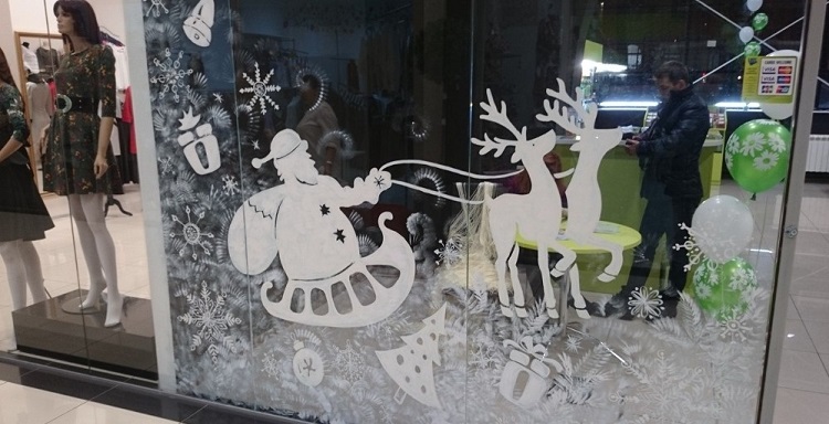 В украшении витрин картинками главное соблюдать минимализм. Тогда пейзаж на окне будет смотреться лаконично и завершено. Конечно же, уже давно прошли те времена, когда большие детали вырезали из бумаги собственноручно. Сегодня, подготовкой новогодних картин для декорирования окон занимаются типографии. Это рисунки на самоклейке, и все что требуется от декоратора или работника магазина, аккуратно приклеить готовый рисунок к окну.
