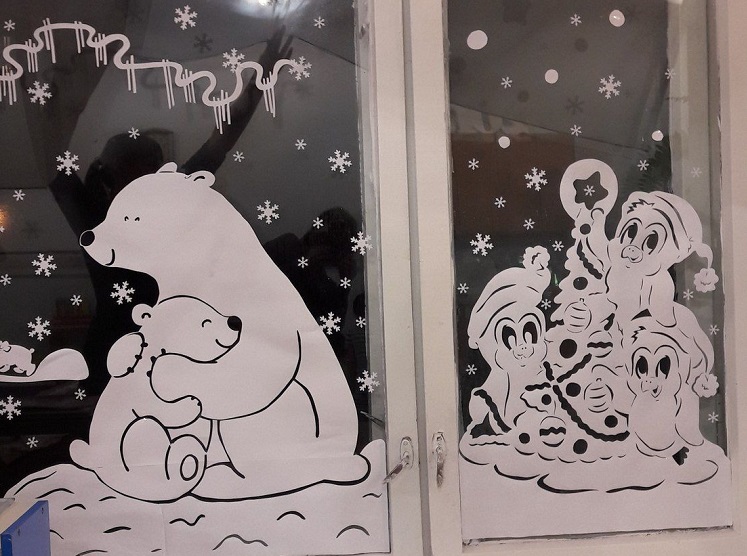 К декору окон школьники подходят более осознано. Они уже имеют представление об украшении и свое видение. Картинки на школьных окон разительно отличаются от тех, которые украшают окна детского сада. Они более взрослые. В основном преобладают фигурки животных, Деда Мороза, Снегурочки, Снеговика, домики, ели, и много снежинок. Снежинки вместе с елью могут быть самостоятельной картиной.