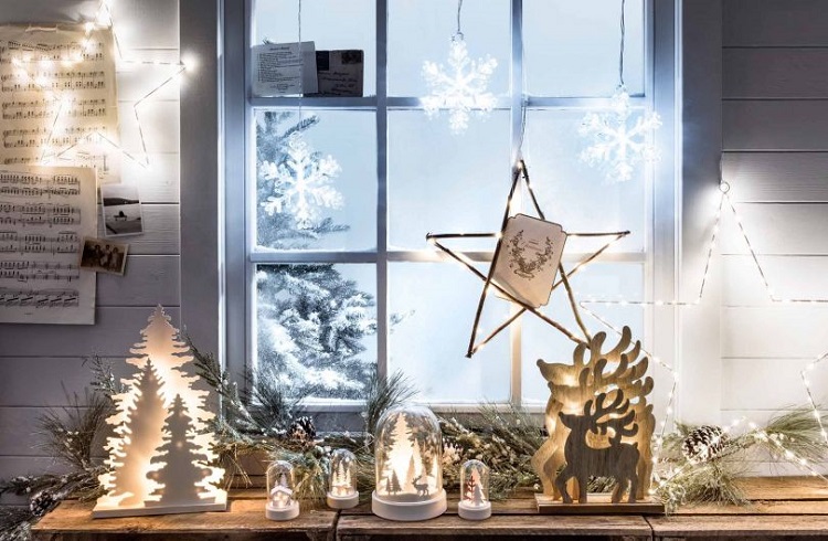 Подоконники лучше декорировать вместе с окнами. Только так можно получить завершенную композицию. Для украшения используют домики, статуэтки, фигурки животных, еловые ветки и обязательно светящиеся гирлянды.