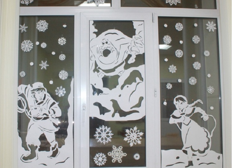 В детском саду на новогодних окнах изображают сказочных мультяшних героев. На школьных новогодних окнах они не совсем уместны, разве что в первом классе. На школьных окнах можно разместить ель, Деда Мороза и Снегурочку, Снеговика, Сказочные дворцы, природу, снежинки, шары, оленей.
