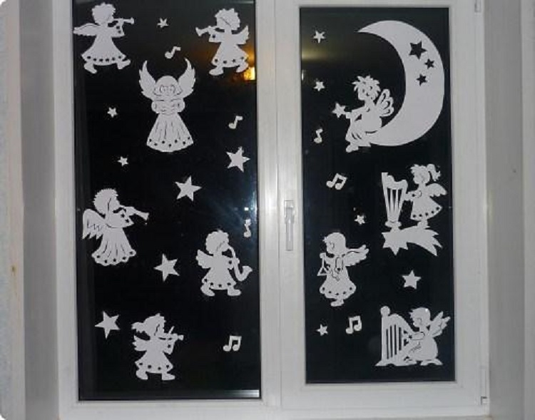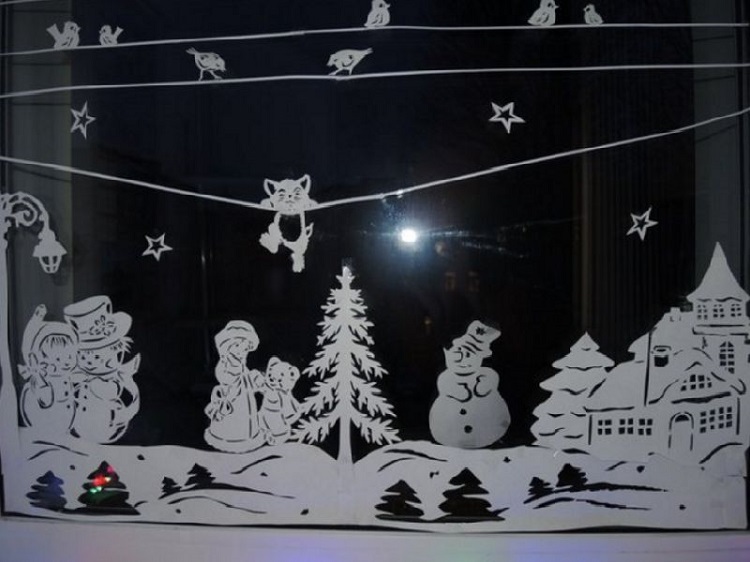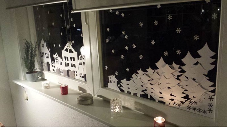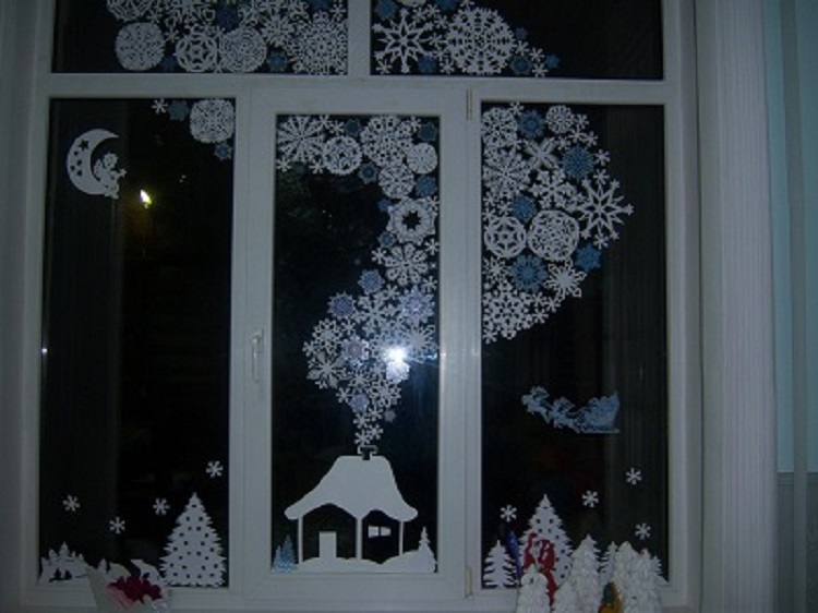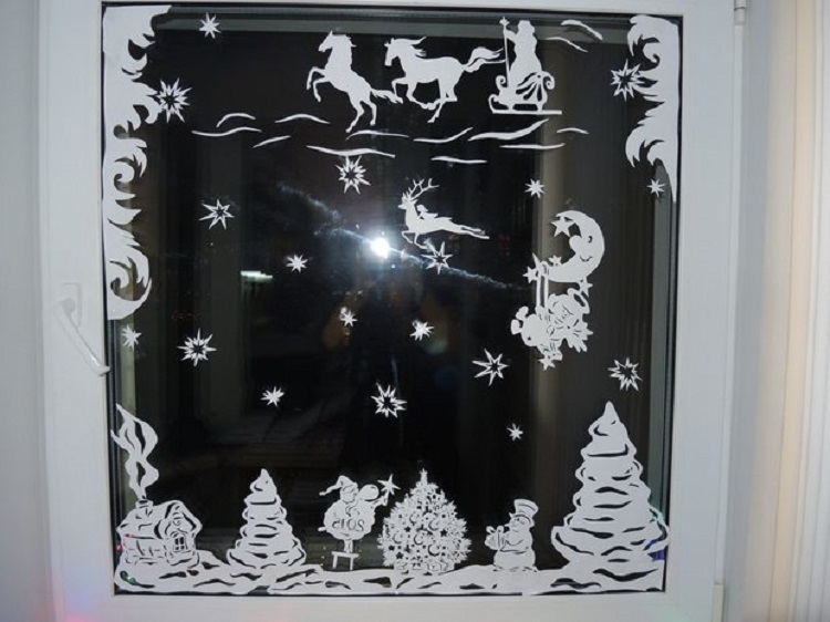 Украшение окон сегодня очень актуально, это модная тенденция. Для того, чтобы украсить дом к встрече Нового Года все средства хороши. В ход идут трафареты, собственноручно вырезанные картинки. Их крепят с помощью воды и мыла.