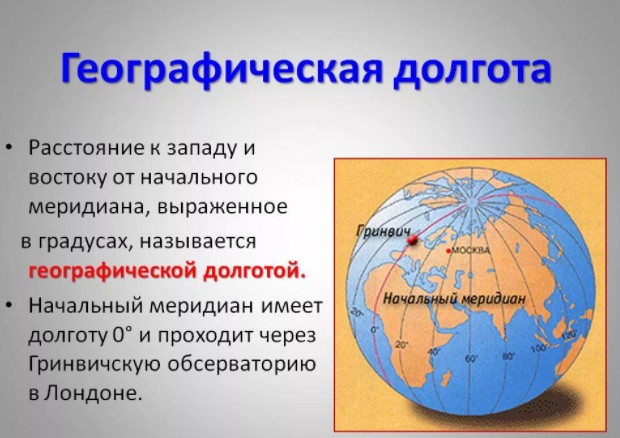Любой объект природы (горы, реки, моря, равнины, океаны, озера и др.) или населенный пункт определяют с помощью координат — долготы и широты. Современные географические карты дают такую возможность. Если широту находят с помощью Экватора, то долготу — при помощи нулевого меридиана, который является началом отсчета, его долгота равна нулю.