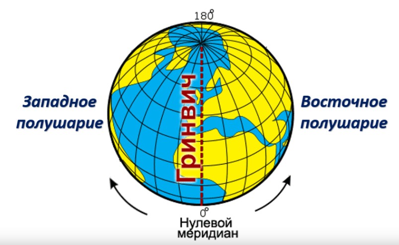 Нулевым меридианом наша Земля поделена на два полушария — Западное и Восточное.