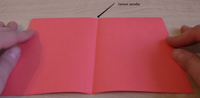 1. Лист согните пополам, сводя меньшие его стороны. Линию загиба тщательно проглаживаем.
