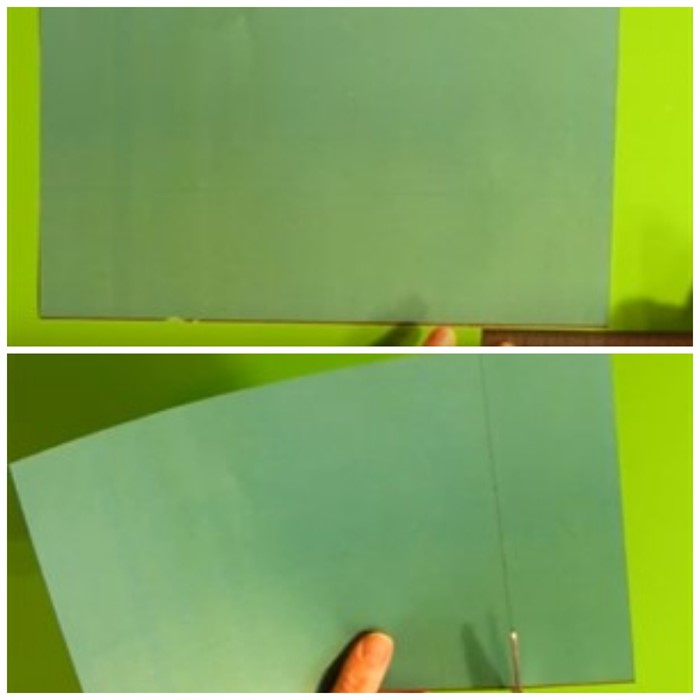 Лист формата А4 зеленой двусторонней бумаги положите длинной стороной к себе. Отметьте верху и снизу по 6 см, проведите линию, лист разрежьте по этой линии.