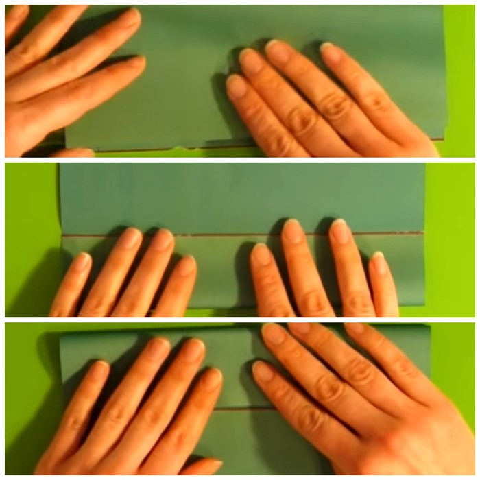 2. Снова складываем лист пополам, сводя короткие стороны, проглаживаем загиб. Должен получиться маленький прямоугольник.
