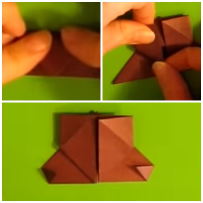 Берем квадрат стороной 9 см из коричневой бумаги, складываем по диагонали в одну, а затем и во вторую сторону. Затем развернем и согнем пополам.