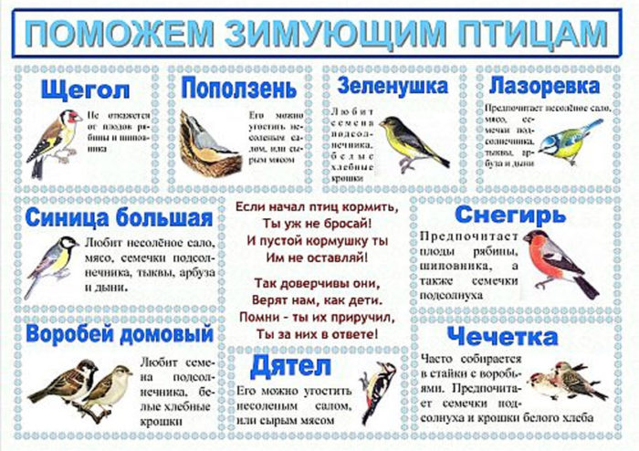 ВАЖНО: При устройстве птичьей кормушки следует регулярно насыпать корм для птиц. Пернатые очень быстро привыкают к местам кормежки, поэтому в непогоду устремляются к этим местам для получения еды. Необходимо следить, чтобы в птичьей кормушке всегда был корм.