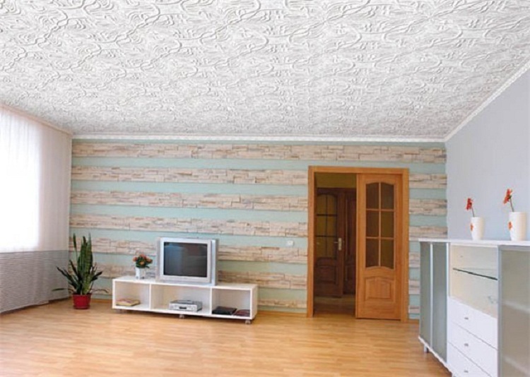 Декоративный потолок из полистироловой плитки. Такой дизайн интересен, более того, плитка укладывается довольно просто, самое главное состыковать рисунок. Технические условия приклеивания указаны производителем на упаковке. Готовый оклеенный потолок можно красить в любую цветовую гамму. При установке осветительных приборов, следует обращать внимание на его быструю воспламеняемость, поэтому лампы устанавливают на расстоянии 30 см от плитки.