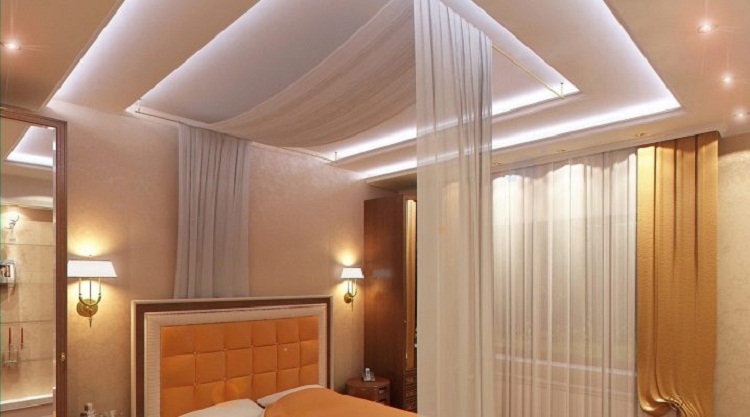 Подвесная многоуровневая конструкция с декоративными тканевыми элементами, точечной системой освещения, скрытой подсветкой.