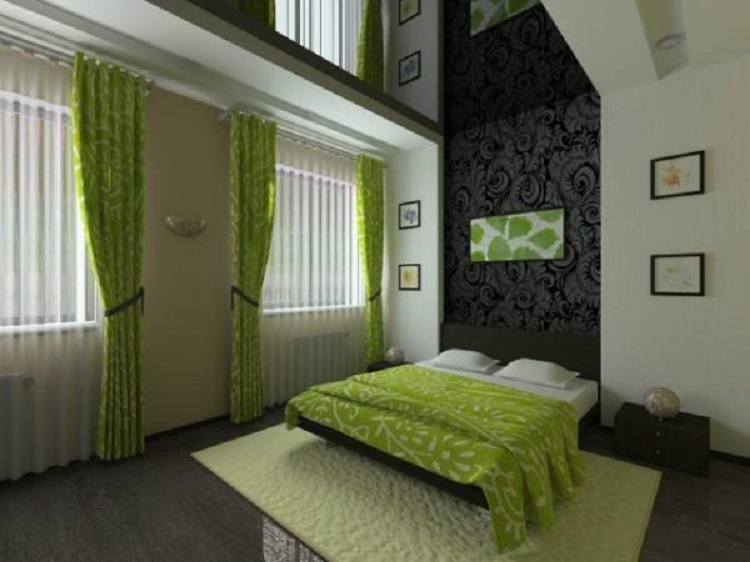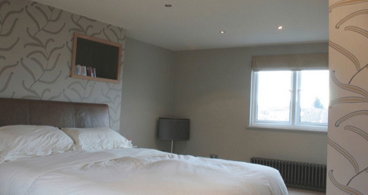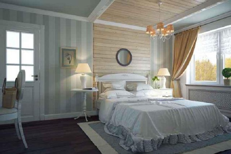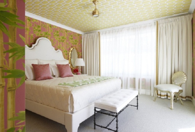 Оклеивание потолочного пространства обоями придает спальной комнате изысканности и шарма.