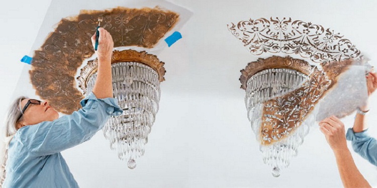 Художественная роспись применяется на финишном этапе. Использовать ее можно на оштукатуренных потолках. Росписью покрывают как отдельные участки, так и весь потолок. Можно рисовать рисунок от руки, можно использовать специальные трафареты.