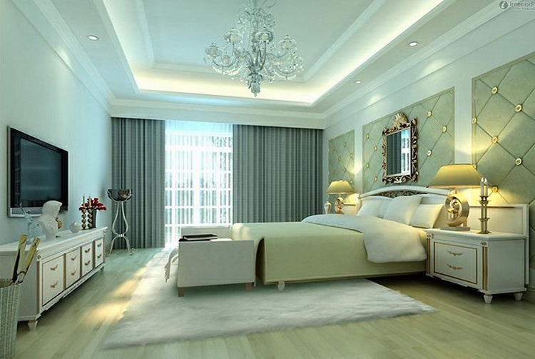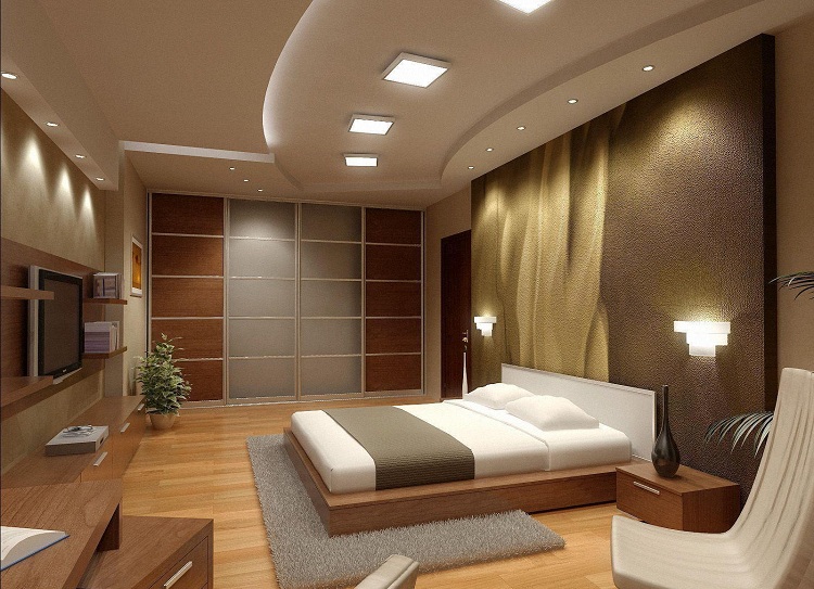 Спальни частных домов, так же как и гостиные могут совмещать несколько техник при монтаже  потолка. В основном устанавливают подвесные или натяжные потолки. Они могут быть как простые, так и многоуровневые. Для спальных комнат рекомендуется установка мелкого точечного освещения.