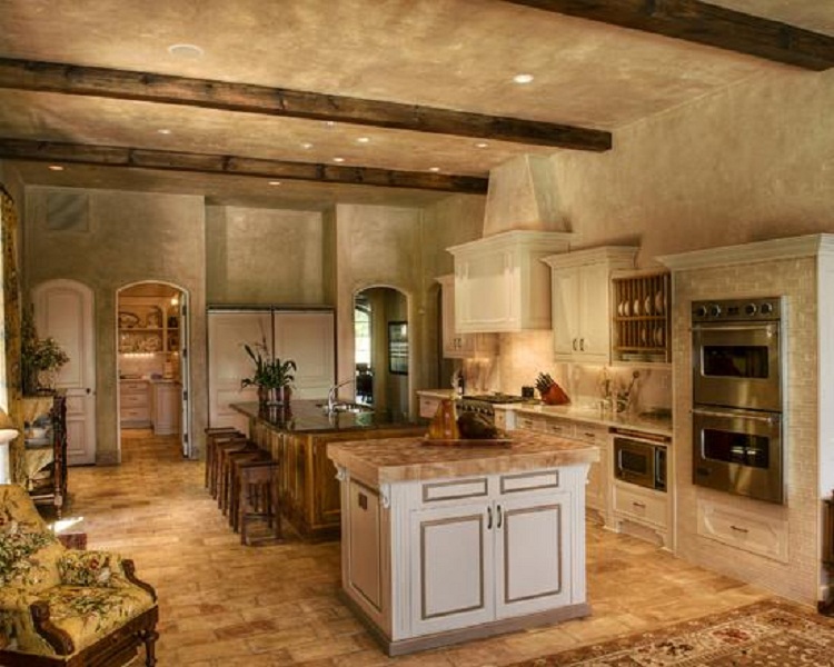 Обычный ровный потолок давно уже не в моде. Более того, за простым шпаклеванным потолком нужно чаще ухаживать, ведь воздействие влаги и пара приводит к осыпанию слоя штукатурки. Фактурные штукатурки влагостойкие, они идеально смотрятся в комбинации с деревянным декором.