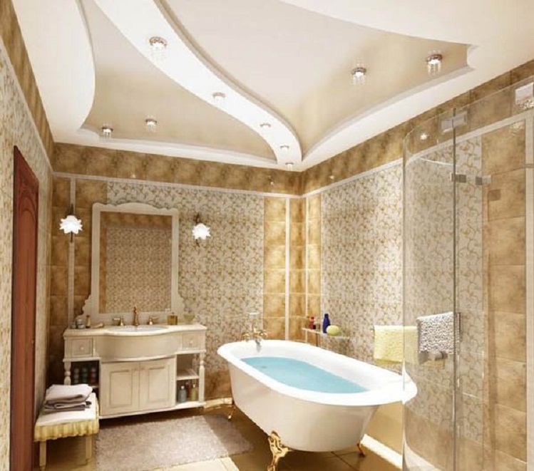 Дизайн потолка можно выбирать любой сложности. Натяжное полотно скроет все дефекты чернового потолка, проводку. Эффективность такого потолка для ванной 100 %, он влагостойкий.