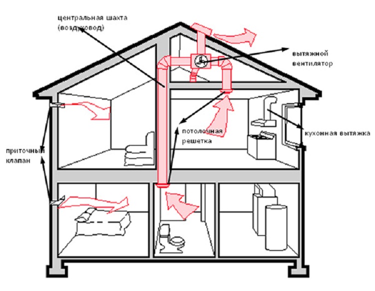 Лучше всего для частных домов подходит естественная система вентиляции. Она размещается в потолке, ей совершенно не нужно электричество. Единственный недостаток такой системы заключается в невозможности проконтролировать поступление холодных потоков воздуха. В теплое время она не эффективна, так как притягивается только холодный воздух.