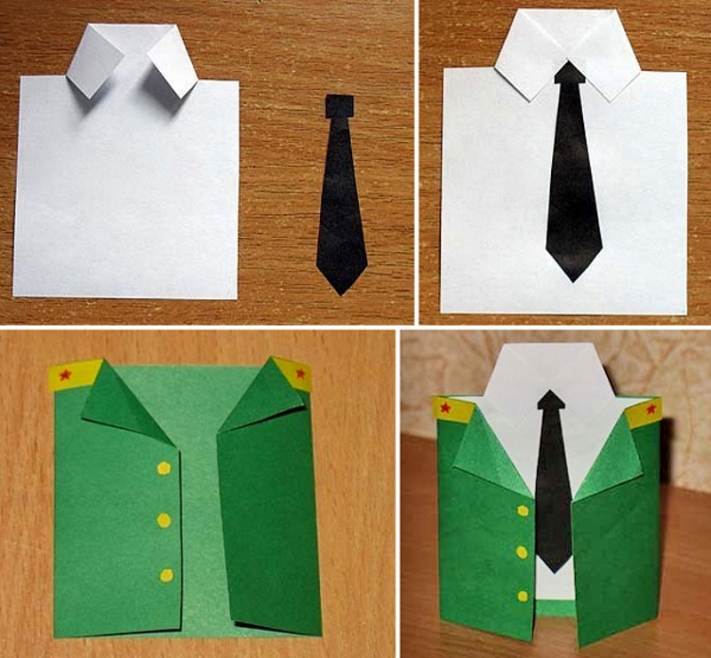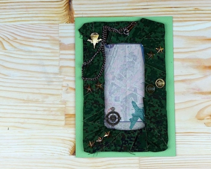 Открытка, сделанная в виде солдатского мундира, смотрится оригинально и интересно.