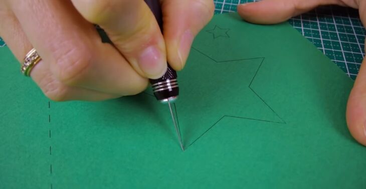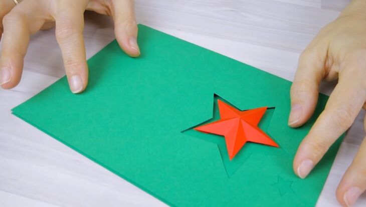 Основой для открытки послужит плотная бумага зеленого цвета, лист делится пополам и пунктиром намечается линия сгиба. С одной стороны рисуется контур звезды и аккуратно вырезается. Маленькая звездочка рисуется чуть повыше.
