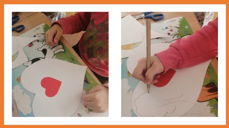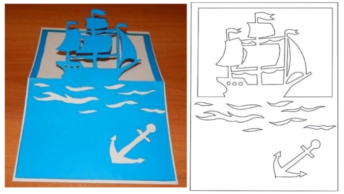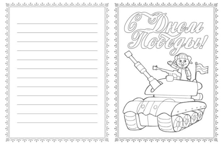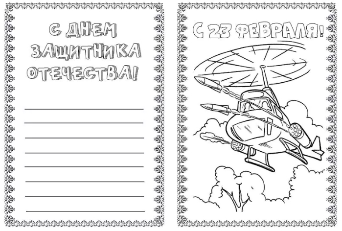 Так же, ребенку можно предложить воспользоваться трафаретом, его нужно распечатать и разукрасить. Для изготовления открытки подготовьте плотную бумагу или картон, согните заготовку пополам, на одну сторону наклейте рисунок, его следует разукрасить, на другой пишется пожелание.