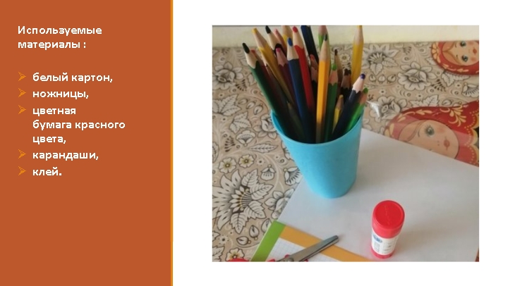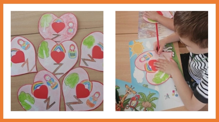 Ребятам младшего возраста необходимо объяснить кому адресована открытка и совместно с ними определиться с тематикой. В данном варианте она выполнена в форме сердца, на котором изображены матрешка, березка, радуга — традиционные символы российских широт и буква «Z». Последовательность работы вы можете видеть на фото.