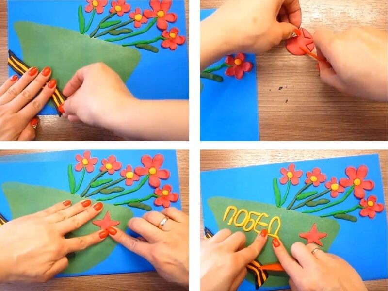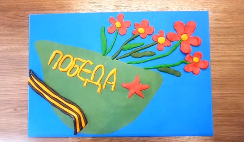Детям помладше можно поручить сделать открытку с помощью пластилина. Цветную основу приклеить к картону, сверху — вырезанную каску из зеленой бумаги. Цветы и надпись слепить из пластилина. На угол прикрепить георгиевскую ленточку.